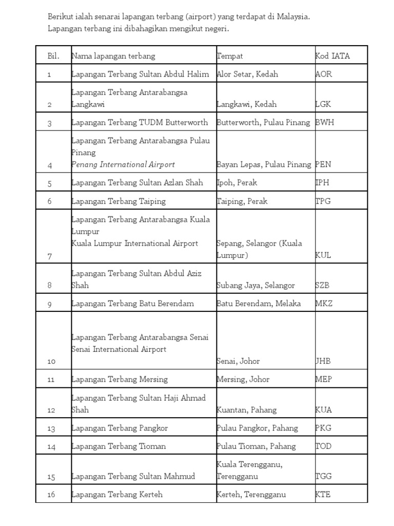Senarai Lapangan Terbang Di Malaysia Wikipedia Bahasa Melayu Ensiklopedia Bebas